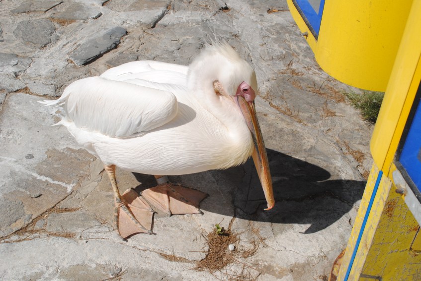 Petros, leader of the “Royal Family” of Mykonos. Years ago an injured pelican was rescued by fishermen and norished back to health. The bird never left so was nicknamed “Petros” and wandered around town as he wished as the revered symbol of Mykonos. Now, several generations later, Petros IV or is it Petros V, and his royal family of hangers on wander freely and live on restaurant handouts.
