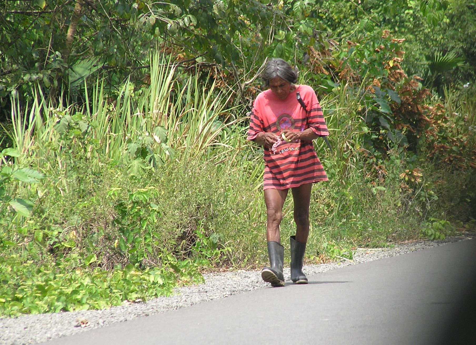 If instead of turning off toward Tocumen Airport, you’d just keep driving you would end up in Central Panama. The Pan American Highway gradually peters out into a gravel road pretty much in the middle of nowhere. When I was driving along this road, hours from Panama City, trying to see how far I could go since my daughter’s plane had been delayed by 12 hours, I passed this guy who was wearing a t-shirt and boots, and ONLY a t-shirt and boots, with his machete under his arm heading for work. Obviously he forgot his pants.