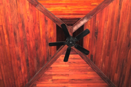Ceiling fan in living room is designed to draw air through the open doors, up and out through a vent opening in the roof. This removes heat and during rainy season keeps air flowing which prevents mold.